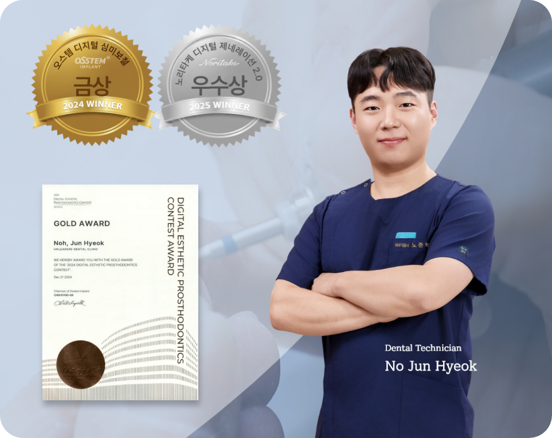 하늘리더스치과에는 ‘2024 오스템 디지털 심미보철 콘테스트 금상’과 ‘2025 노리타케 디지털 제네레이션 콘테스트 2.0 우수상’을 수상하며 실력을 입증받은 전담 기공사가 상주합니다.