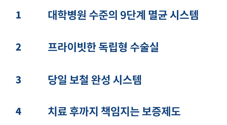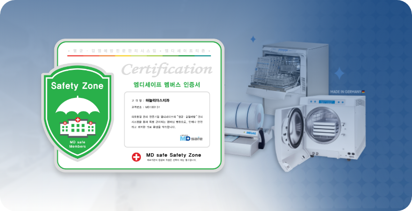 진료의 기본인 위생에 가장 엄격한 기준을 적용합니다. 전문 감염 관리 솔루션을 도입하여 기구 세척부터 멸균, 진료수 관리까지 9단계 엠디세이프(MD Safe) 소독 시스템으로 운영합니다. 눈에 보이지 않는 교차 감염의 위험까지 사전에 차단하여 안심하고 진료받으실 수 있습니다.
