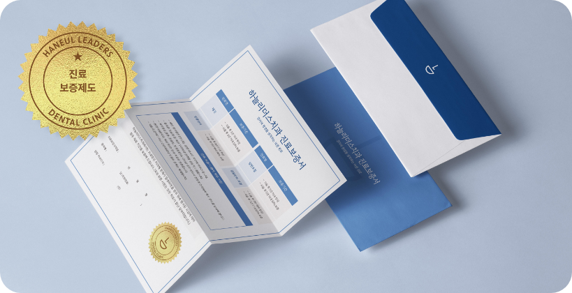 치료의 끝은 꼼꼼한 관리의 시작입니다. 하늘리더스치과는 사용하는 재료와 시술 결과에 대한 책임을 명확히 하기 위해 진료 보증서를 발급합니다. 정기적인 검진과 유지 관리를 통해, 치료받은 치아를 문제없이 오래 사용하실 수 있도록 돕습니다.
